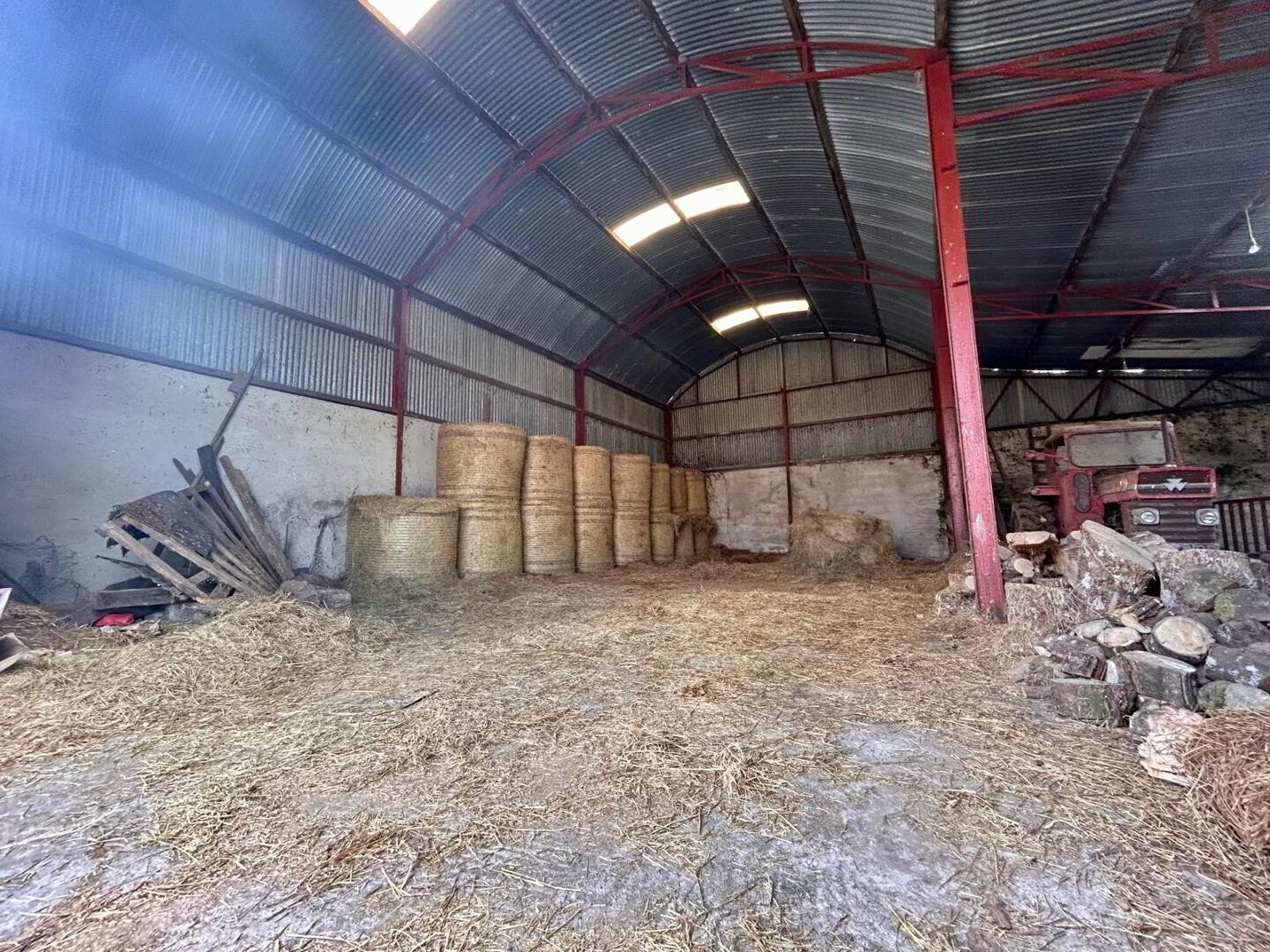 Farm and Domestic Buildings – 3 useful stores, Large 3 bay by 3 bay barn with filled livestock pens. Adjoining 3 bay lean to machinery shed with 1 fitted pen.