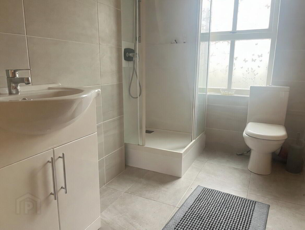 Bedroom 1 - 14'8" x 11'4" less 3'6" x2' external door plus ensuite shower room 8'8" x 4'6"" white suite of shower, wash hand basin and WC, part tiled walls.