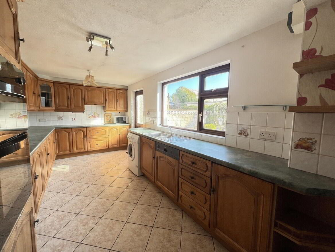Kitchen - 27'5" x 8' Fully fitted with an extensive range of eye and low level solid wood units, tiled around worktops, 1 1/2 bowl stainless steel sink unit, built in electric hob, extractor fan, built in eye level double electric oven integrated dishwasher, plumbed for washing machine, tiled floor.