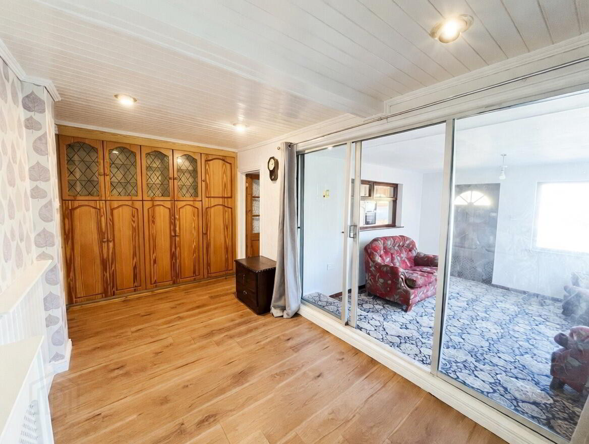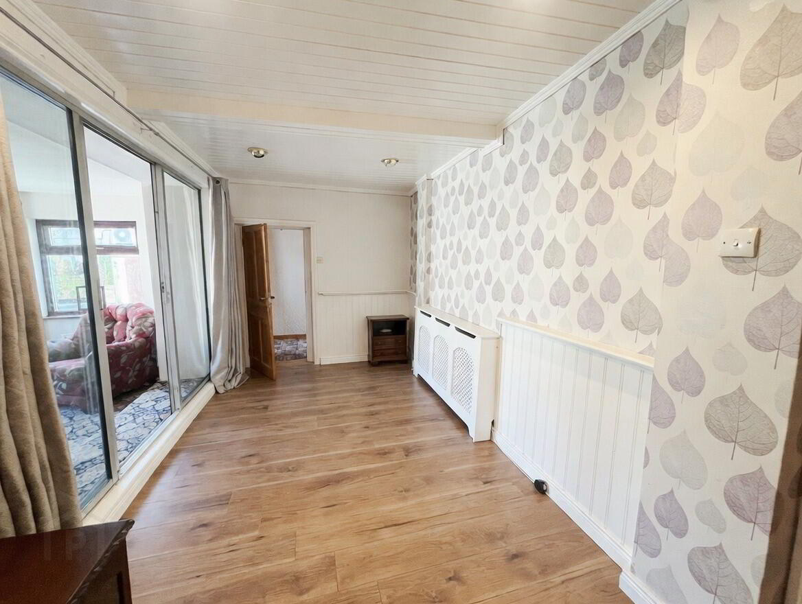 Dining Room - 16'6" x 7'9" wooden laminate flooring, built in wall to wall pine storage cupboards, panelled ceiling with recessed eye ball lighting, patio door with glazed side panels to:- Sunroom 11'9" x 11'6" access to rear.