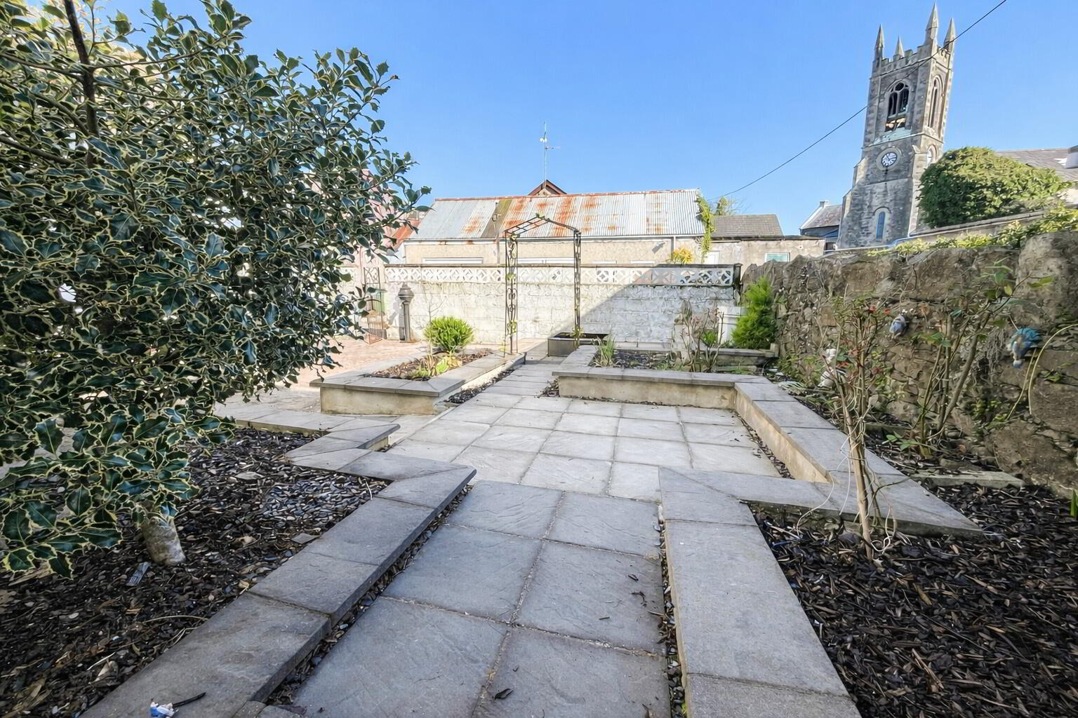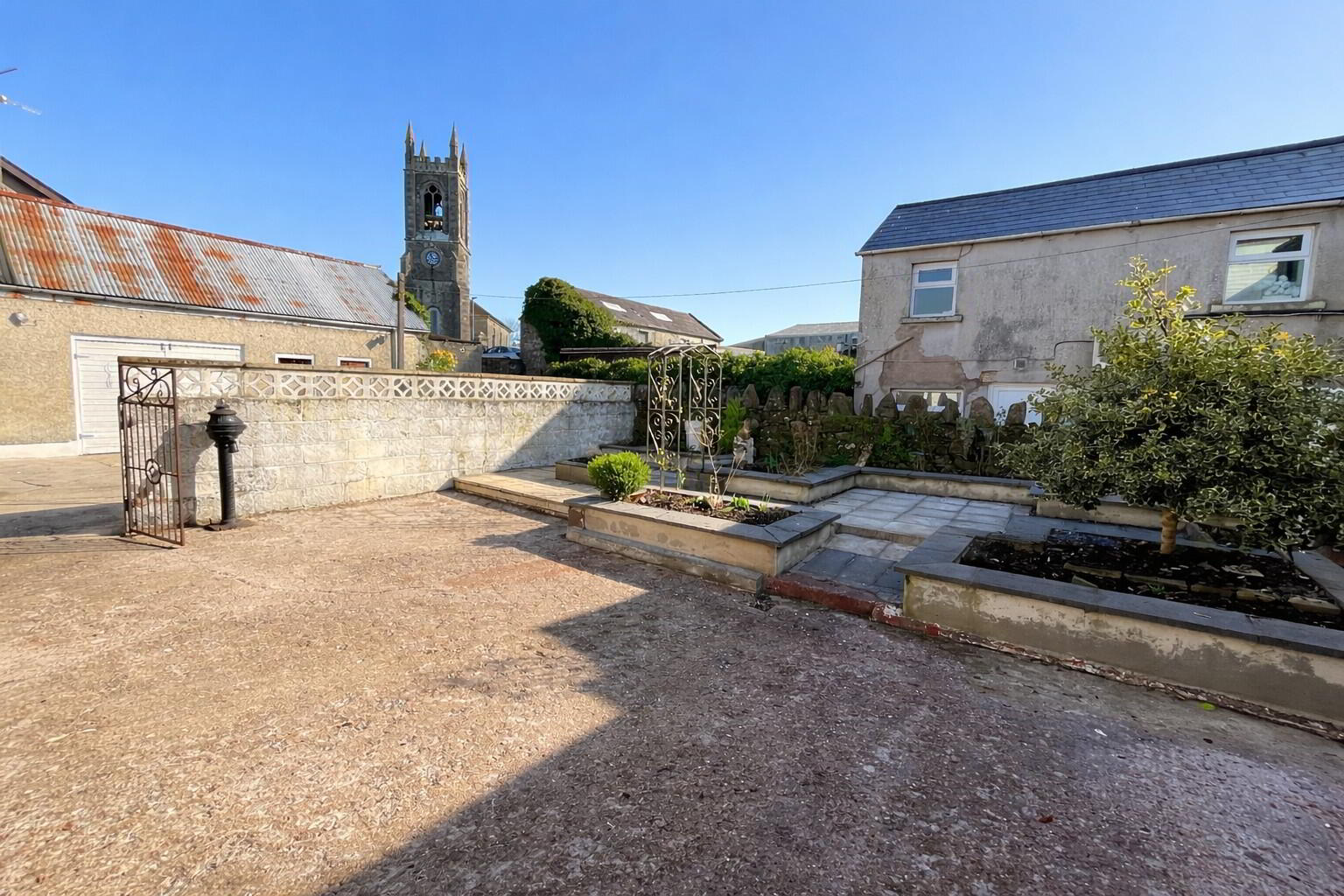 Exterior - To the property's rear is a large courtyard fully enclosed by walls with paved patio areas and a number of raised planted beds together with a greenhouse housing mature grapevines.